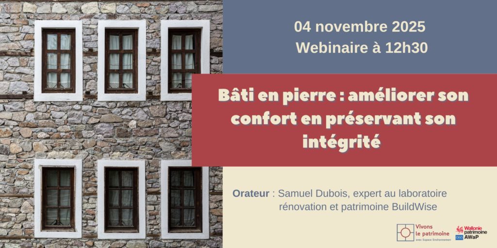 De nombreux propriétaires de bâti ancien sont confrontés à des problèmes d’humidité. Comment en identifier la cause ? Comment intervenir ? Comment la traiter ? Quels sont les points de vigilance essentiels lors d’une rénovation énergétique ? Julie Desarnaud, spécialiste dans la physique des matérieux à KIK-IRPA est invitée à présenter ces notions et les remèdes pour parvenir à traiter les problèmes d’humidité dans le bâti ancien.